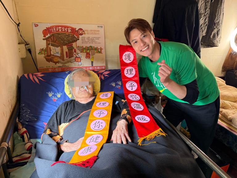 ▲為關懷弱勢族群、傳遞年節溫暖,創世基金會邀請帥氣男神張睿家擔任「第36屆寒士吃飽30」公益大使,他13日特地與創世台中院到宅服務團隊一同前往探訪林奶奶,並送上物資及滿滿祝福。(圖╱創世基金會提供)