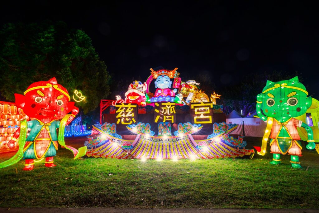 除「光環境燈組」勇奪金獎外,其餘4組宮廟主題燈組也抱回1金3銀佳績,充分展現「幸福祈願村」燈區在文化策展與燈藝創作上的豐厚實力。其中,大里七將軍廟「忠義護鄉土」燈組榮獲「照明設計類」金獎,以Q版七將軍爺造型結合精湛燈藝工法,生動傳遞守護鄉里的忠義精神,讓在地信仰文化以創新形式精彩躍上國際舞台。