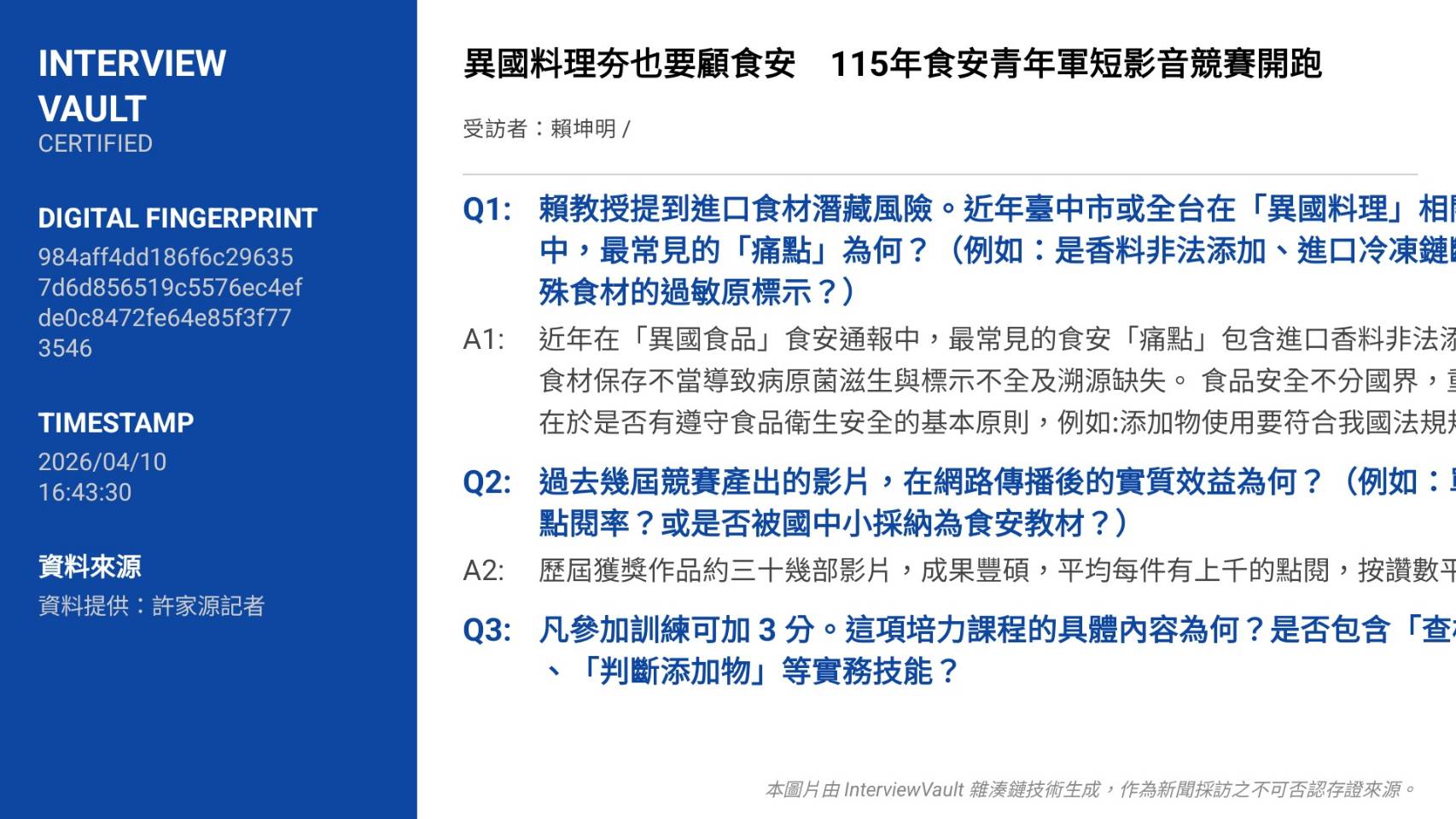 本次競賽特別設計加分機制,凡參賽隊伍全員完成5月9日「食品志工特殊訓練」培力課程,即可在總成績加3分;課程內容除了食安基本知能,還邀請AI專家傳授應用技巧、行銷專才分享評審與民眾關注點,讓學生從查核標籤、判斷添加物到拍攝腳本,都能具備實務技能。報名與腳本截止5月17日,影片6月28日前繳交,評選採專業70%加網路人氣30%,得獎名單8月28日公布。冠軍可獨得3萬元,期望透過這場青年影像盛事,讓台灣下一代不僅會吃全球美食,更懂得守護餐桌背後的安全與永續。