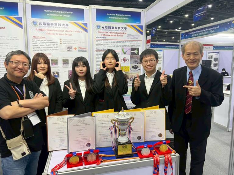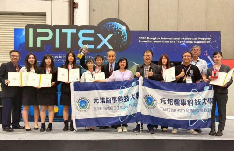 元培醫事科技大學師生團隊參加2026 曼谷國際發明展,在來自全球數百件優秀作品的激烈競爭中,憑藉醫療跨域整合AI技術、及智慧照護寵物保健創新,一舉斬獲3金、2銀、1銅及1項「大會傑出發明與創新特別獎」。