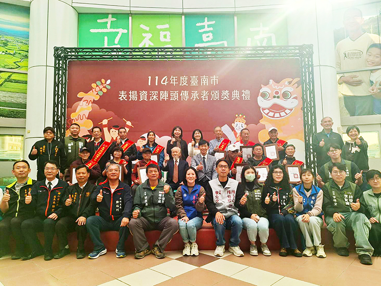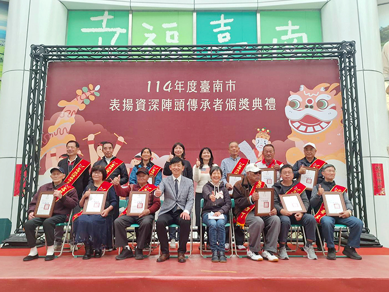 臺南市政府為深化陣頭文化保存與傳承,延續113年訂定之臺南市政府文化局表揚資深陣頭傳承者作業要點,持續受理民眾提報長期投入陣頭文化之教練。經推薦與審查程序,於114年度遴選出十二位長年耕耘藝陣、深具代表性的資深教練,今年於頒獎典禮中公開表揚,由副市長葉澤山出席頒獎,肯定教練們多年來默默付出、薪火相傳的文化貢獻。
