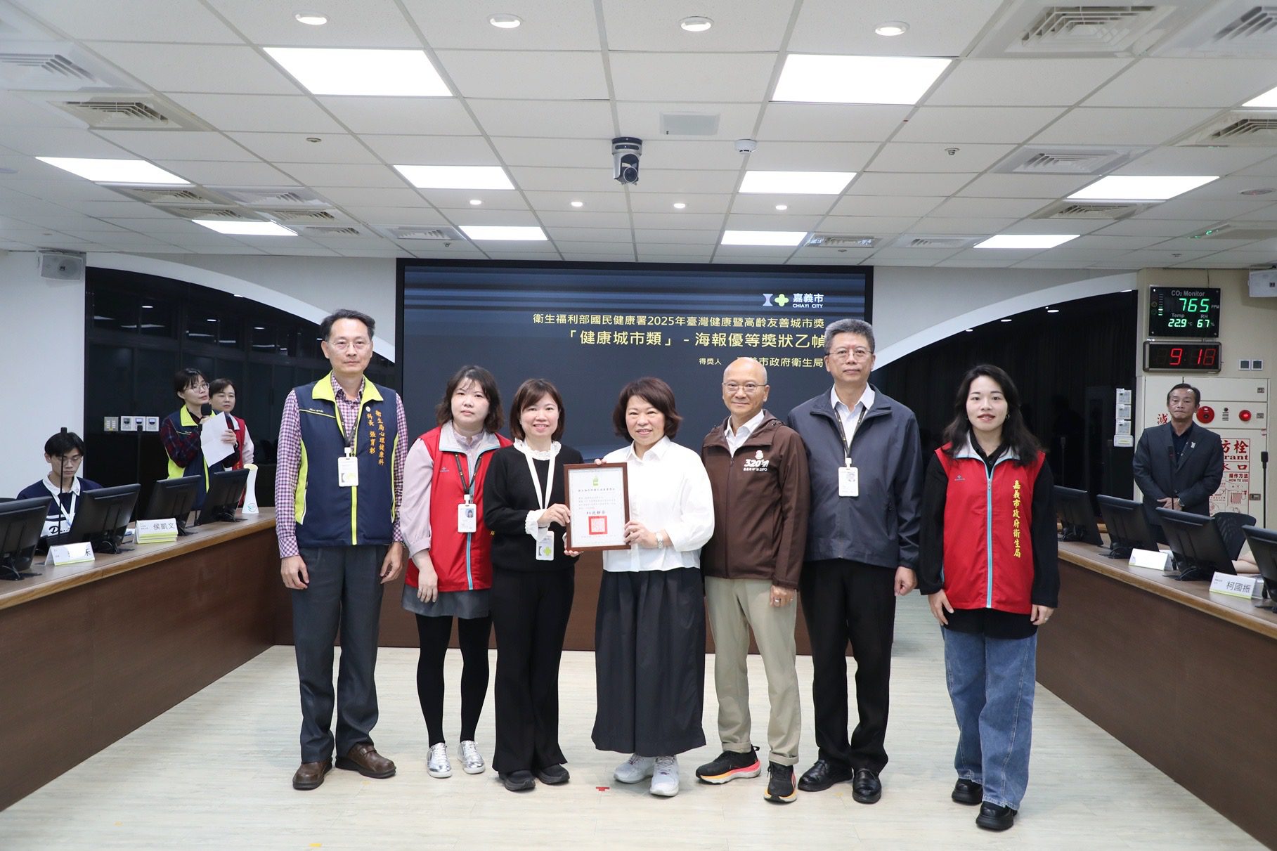 嘉義市政府昨(30)日於市務會議中轉呈5大獎項,包含衛生福利部國民健康署「114年臺灣健康城市暨高齡友善城市獎項評選」以及「114年國家永續發展獎」。市府分別榮獲健康城市類健康平等獎、健康城市類韌性與創新獎佳作、健康城市類海報獎優等以及高齡友善城市類海報獎銀獎;市府於「114年國家永續發展獎」選拔中,亦榮獲政府機關類國家永續發展獎。得獎單位衛生局、消防局、社會處將獎座、獎狀轉呈給市長黃敏惠,與市府團隊及市民共享榮耀。