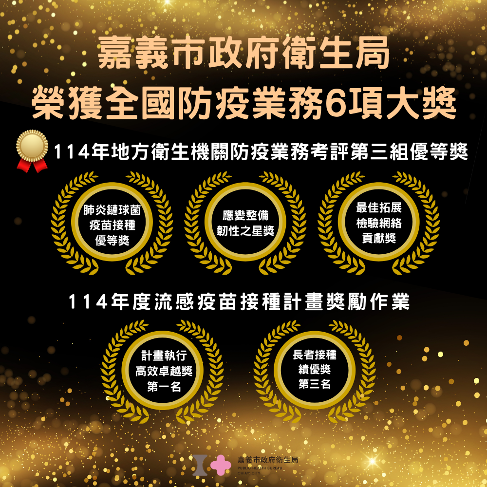 在新興傳染病應變整備方面榮獲「應變整備韌性之星獎」;檢驗量能強化方面榮獲「最佳拓展檢驗網絡貢獻獎」;在疫苗接種推動方面,榮獲「肺炎鏈球菌疫苗接種優等獎」及114年度流感疫苗接種計畫獎勵作業「計畫執行高效卓越獎第一名」與「長者接種績優獎第三名」,共計6項獎項,充分展現嘉義市在防疫整備、檢驗量能強化及疫苗覆蓋率提升上的優異成果。