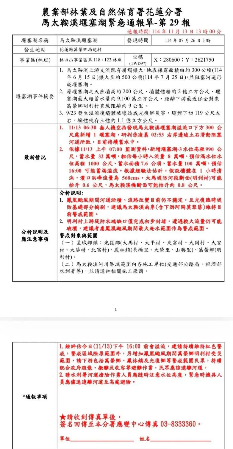 依據農業部林業及自然保育署馬太鞍溪堰塞湖緊急通報指出,11月13日清晨6時30分,無人機空拍發現馬太鞍溪堰塞湖溢流口下方 300 公尺處新增一處堰塞湖,研判於凌晨 2時53分右岸邊坡土石滑動阻塞河道所致。上午7時監測資料,新增堰塞湖水位高程990 公尺,蓄水量32萬噸,粗估每小時入流量8萬噸。預估滿水位水位高程 1000 公尺、蓄水面積 7.6 公頃、蓄水量 100 萬噸,預估下午四時可能蓄滿溢流。
