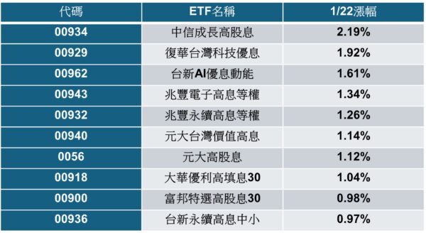 1/22高股息ETF漲幅排行榜