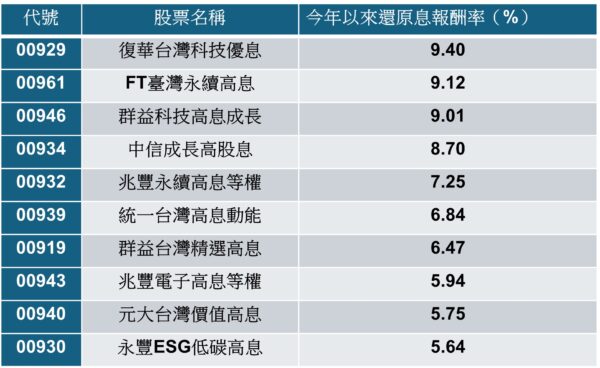 高股息ETF今年以來績效表現前十名