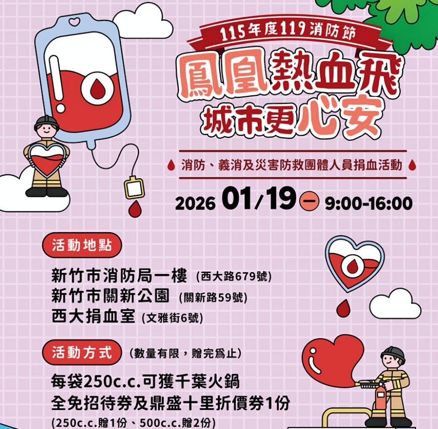 新竹捐血中心於捐血月期間安排多場捐血活動接力登場,尤其係1/19日聯手竹市消防局將共同盛大舉辦「115年消防、義消及救難志工人員119捐血」活動,新竹捐血中心和竹市消防局聯手合辦的捐血活動,今年堂堂邁入第21年,今年捐血活動主題係「鳳凰熱血飛.城市更心安」,這場活動安排在竹市消防局一樓、西大捐血室及關新公園等三個地點舉辦,主辦單位提供豐富贈品感謝捐血人,每袋250c.c.可獲千葉火鍋全免招待券及鼎盛十里折價(250c.c.贈一份,500c.c.贈二份,數量有限,贈完為止)。