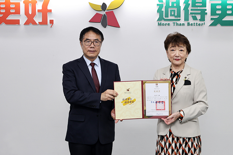 ▲黃偉哲市長頒發風災捐款感謝狀給郡和子市長。