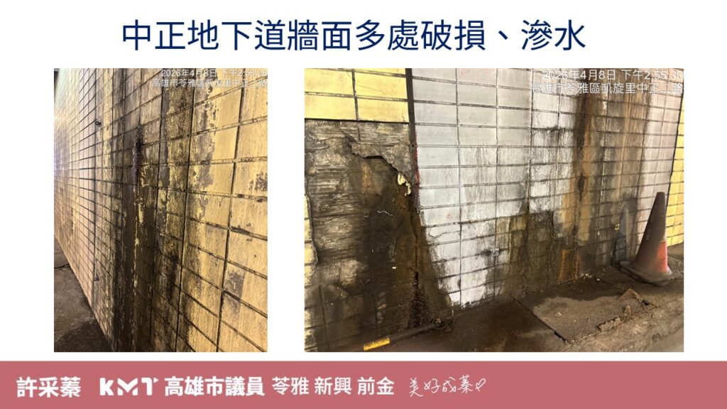 許采蓁現場出示去年 11 月與昨日拍攝的對比照片,顯示中正地下道牆面嚴重滲水、隆起破損。她揭露,去年會勘紀錄明確標註由道工科處理牆面破損,結果會勘當天主責單位竟然沒派人出席,半年過去現場依然故我,僅放三角錐了事 。許采蓁憤怒表示,民間業者評估僅需 3 天即可修補完成的工程,工務局給了 180 天卻連動都沒動,難道要等淹大水或地下道塌陷才要處理? 針對此點,道工處長林志東現場向議員致歉,坦言防水層老化,並承諾會加強督導,於兩週內修復完畢。