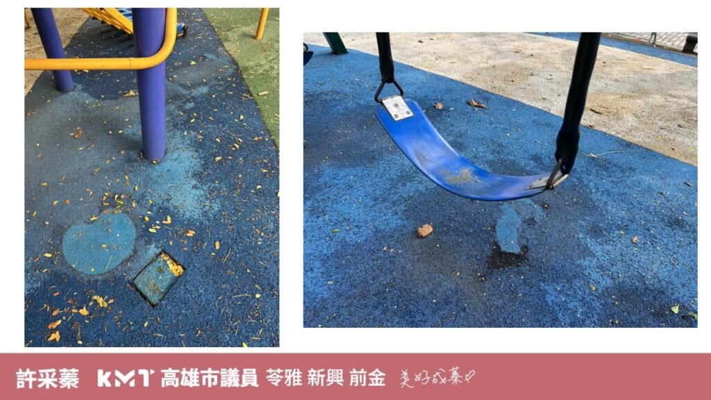 除了地下道問題,北凱旋公園的兒童安全亦是許采蓁關心的重點。她指出,里長早在去年就反映遊戲場地墊破損及接面高低差問題,導致多名兒童絆倒,當時公園處承諾會改善,但現況卻仍是地墊老舊不堪。