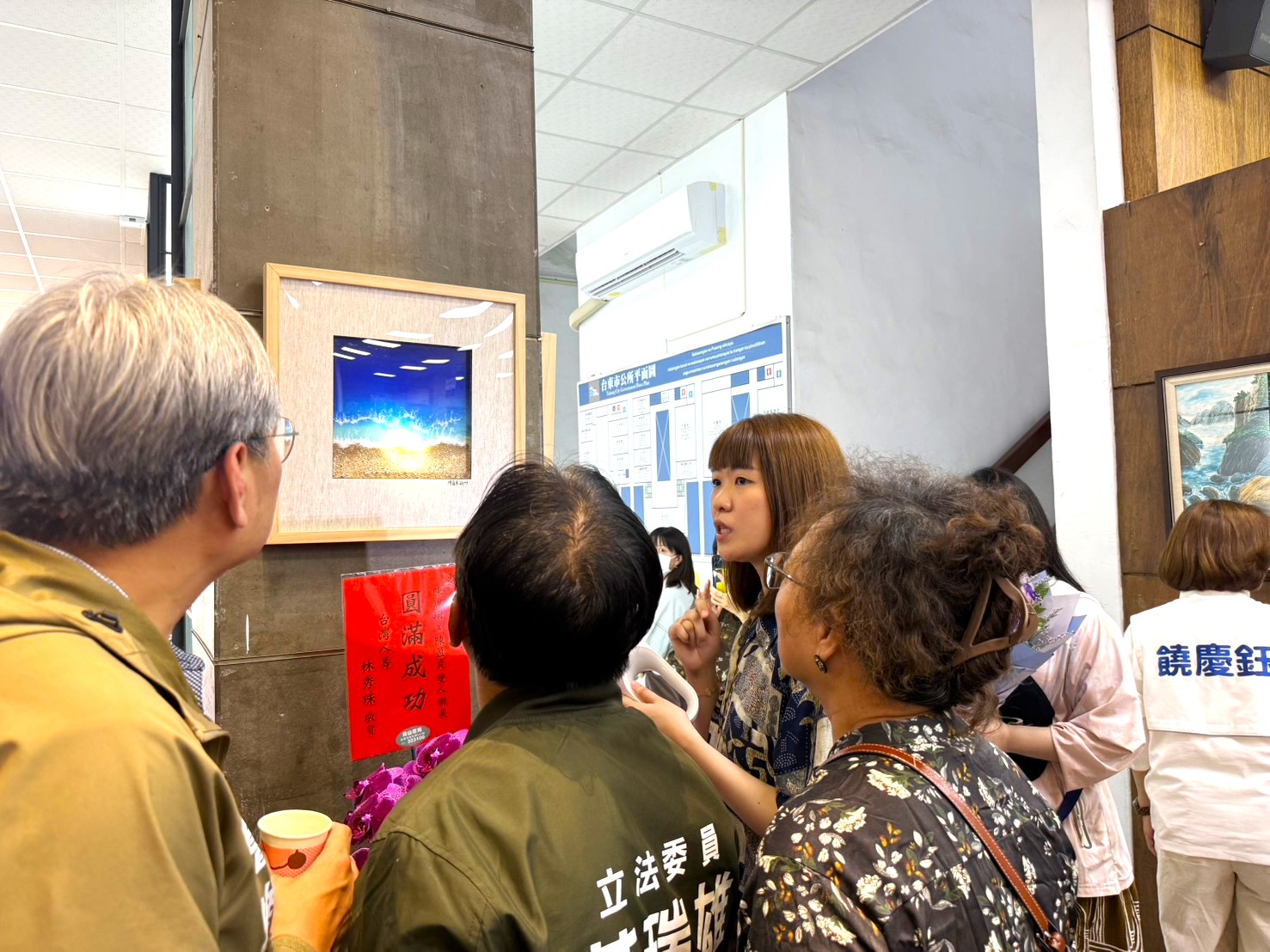 此外,臺東系列作品《金針山》與《蘭嶼》則展現科技與工藝的結合,作品邊框運用AI圖像生成當地特色景物,再以雷射雕刻製作完成;畫作內層則以水彩呈現創作者親身走訪金針山與蘭嶼時的深刻感受。透過數位技術的精準與手繪的溫度相互交織,陳珮珊希望引發觀者對臺東自然景色的好奇與共鳴。陳珮珊感性地說,十年前曾於臺東市公所展出作品,時隔多年再次回歸,別具意義,誠摯邀請各界蒞臨參觀。