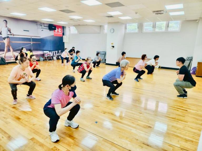 ▲長青及高年級生俱樂部課程–長者深蹲訓練,鍛鍊臀腿、核心肌群。 (圖/記者張建奎攝)