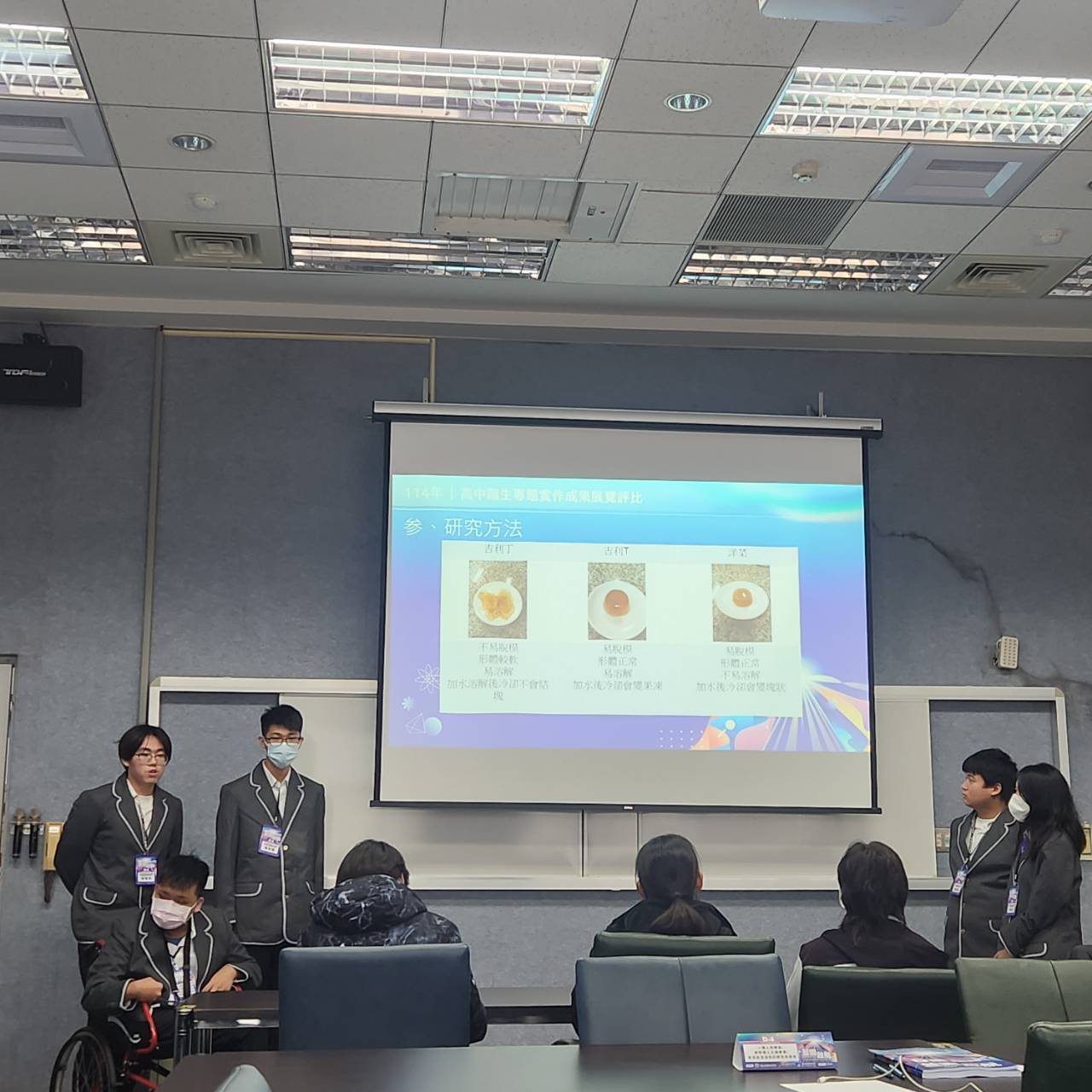 值得一提的是,本組成員之一、來自餐飲科的鄭順謙同學,身為多重障礙學生,因手部萎縮、無法行走,全程需以輪椅代步。然而他並未因身體限制退縮,反而主動投入資料整理、研究分析、專題撰寫等任務,以毅力與態度感動全場,為團隊爭取到更多肯定。