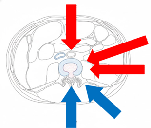 ▲手術以間接減壓的方式,從後腹腔進入(紅色箭頭),有別傳統從脊椎腔(藍色箭頭)切入,因此能夠不破壞骨骼不撥弄脊椎神經,大幅減低神經損傷機率。(圖╱台中市醫提供)