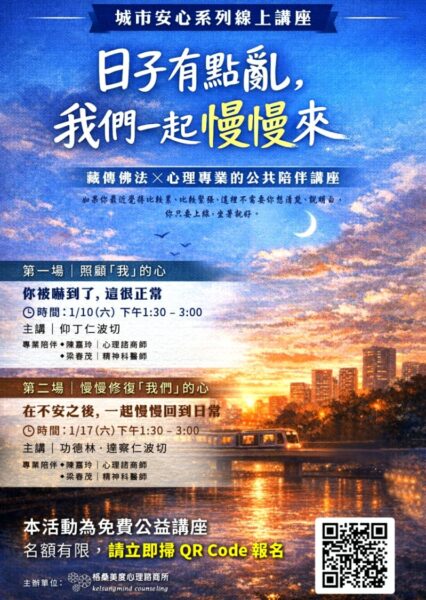 兩場講座皆將由精神科醫師與心理諮商師共同參與回應,從心理健康專業角度協助整理與轉譯內容,讓參與者能獲得具體、可行的自我照顧方向。主辦單位強調,此系列並非宗教活動或治療課程,而是一項公共陪伴行動,希望在社會氛圍不安之際,提供一個安全、溫和、可被理解的空間。「城市安心系列」為免費線上講座,開放一般民眾報名參加,期盼在不安的時刻,為城市提供一個可以慢慢安住、好好說話的公共空間。名額有限,詳情請至報名網站查詢 https://reurl.cc/gnlrWN