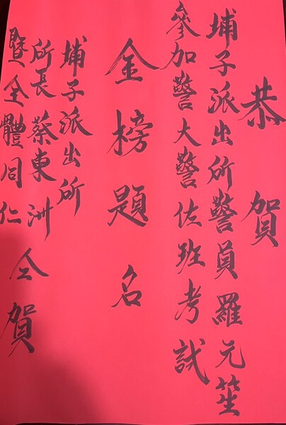 無論是登錄名冊、撰寫榜單、製作橫幅,甚至里民有需求時即興揮毫,呂先生皆樂於協助,其筆力蒼勁、字體渾厚,深獲地方讚譽。此次親筆書寫紅榜祝賀員警金榜題名,更被同仁稱為「神筆手」,為這份榮耀增添滿滿祝福與喜氣。