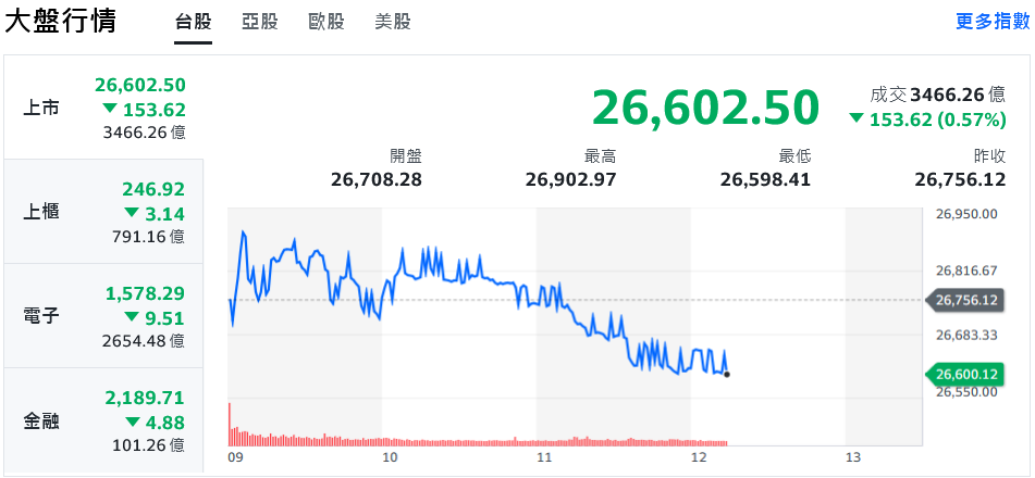 台股週三(19日)震盪走低,盤中回測26600點水位,再創一個月新低,權值股表現不振,記憶體、PCB、塑化等熱門族群無力上攻,資金轉進被動元件、半導體設備等輪動,預估成交量約4900億元。