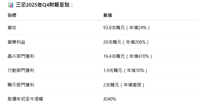 在人工智慧基礎建設擴張的強勁帶動下,全球記憶體龍頭三星電子(Samsung Electronics)宣布2025年第四季營業利益飆升至20兆韓元(約139.8億美元),年增逾三倍,刷新單季歷史紀錄,並符合公司先前預估。根據《路透》報導,分析師預期這波來自AI的記憶體超級循環(Supercycle)將延續至2026年上半年,推動整體利潤進一步躍升。
