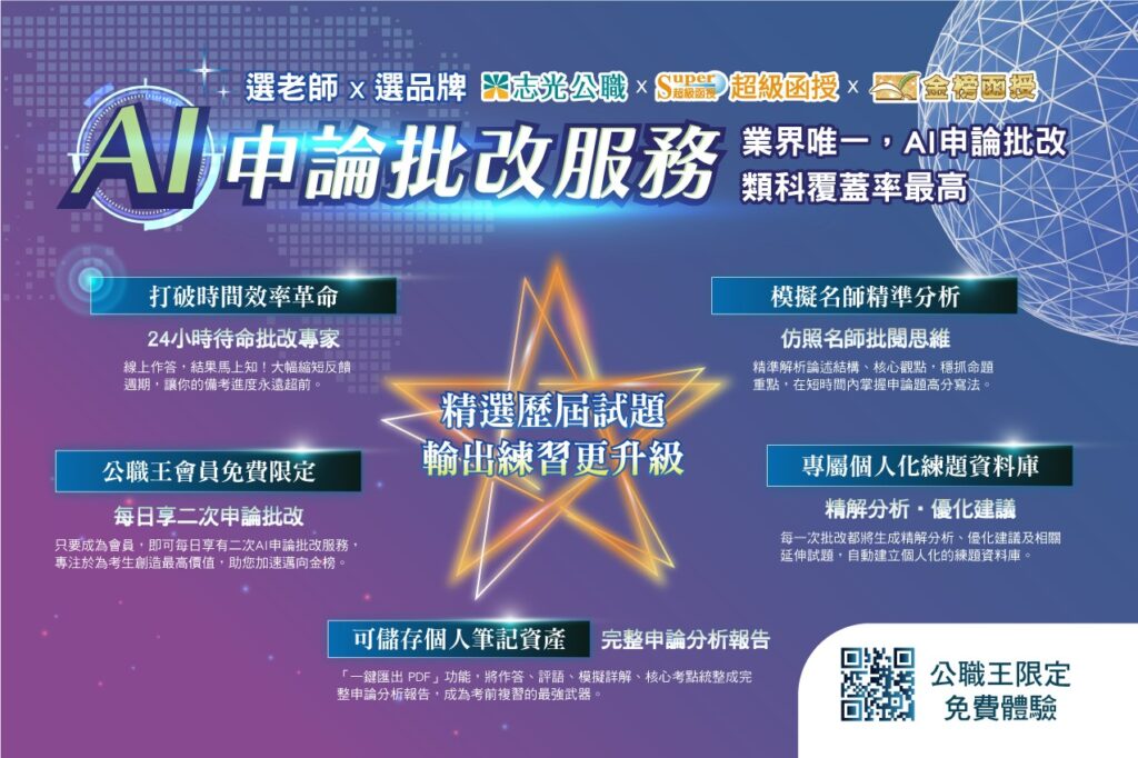【記者張可芙/綜合報導】 深耕公職輔考領域超過45年的志光教育科技集團,憑藉卓越的教學品質與創新的AI學習科技,持續在公職輔考中交出亮眼成績單。在114年高普考、司法特考、一般警察等考試中,多項考試囊括前10名優異成績,志光學員成績斐然,其中多個熱門類科更創下每3人就有2人來自志光的傲人紀錄。僅114年高普考錄取總人數,志光體系就培育出近1600名學子上榜,不只總錄取成績耀眼,前三名佔榜更是業界第一,勇奪24大狀元、14大榜眼、23大探花,共計取得61席全國前三名次。致力於公職輔考的志光教育科技集團,在高普、司法、一般警察等熱門公職輔考上榜總人數,實為全國之冠。 業界首創!志光最新推出「AI申論批改服務」 解決考生申論準備痛點 申論題一直是公職高分上榜的關鍵。114高考及普考一般行政雙料金榜黃仲豪同學坦言,申論題曾是他的「死穴」,但在備考後期,他將申論題作為準備核心,透過上課吸收老師擬答並轉化為自己的語言,並積極查找法條、判例、釋字等引用資料,為申論加分。 另一位以高中畢業之姿打敗眾多大學生、拿下114普考一般行政的高巧芠同學,更是在政治學申論題取得高分(2題分別拿下20分及23分)。她分享,克服挑戰的秘訣是將申論題解題書從頭到尾親筆寫過一遍,寫完後再用自己的話覆述,同時關注如AI等重要時事議題,將基本概念與時事結合。 為精準解決申論題準備的痛點,同時因應未來國考線上作答趨勢,志光教育科技集團領先業界推出「AI申論批改服務」,標榜「業界唯一,AI申論批改類科覆蓋率最高」。這項最新服務能24小時待命批改,快速反饋,並提供精選歷屆試題、模仿真跡師資分析、專屬個人化練習資料庫,讓學員能隨時獲得精準解析、核心觀點、擬答要點,在最短時間內掌握高分寫法。即日起,志光集團官方網站-公職王會員每日更享有兩次免費申論批改的體驗機會。https://www.public.com.tw/event/aifeedback/index.html 學習效率革命性首創!「 AI學習系統」重新定義國考學習標準 志光不僅在申論題批改上導入AI技術,更革命性全面推出「 AI學習系統」,重新定義國考學習新標準。該系統搭載尖端AI技術,擁有五大核心功能: AI字幕系統:語音辨識、同步顯示字幕,透過視覺與聽覺提升專注力。 AI解惑系統:24小時即問即解,精準定位課程片段與關鍵重點,隨問即解。 AI測驗系統:根據知識點出題,生成個人化題組,優化神經連結,達到長期記憶。 AI筆記系統:創新時間戳記,一鍵跳轉對應影片,提高複習效率。 AI考點系統:智能建構知識點,將章節模塊化,支援碎片化時間高效率複習。 志光教育科技集團表示,這套最新發表的AI學習系統已陸續應用於115年度課程,類科詳情可至志光全國服務門市洽詢,志光45年以來,始終致力於透過科技化、個人化的輔考服務,幫助更多考生在競爭激烈的國考中脫穎而出。 響應政府政策 志光推出學費優惠券助考生圓夢 響應政府普發萬元政策,志光教育科技集團也特別發出考取生推薦券,並擴大公務人員推薦方案均可折抵2000元學費,搭配旗下樂旅國際旅行社500元團費優惠券等,鼓勵有志投入公職的民眾把握機會,透過志光卓越的教學資源及最新AI學習系統,早日實現上榜目標。課程與優惠方案,請密切關注志光官方網站與官方LINE。 原始新聞來源 狂賀上榜佳績!志光勇奪61席全國前三名,業界首創「AI批改+AI學習」,再祭學費優惠券助圓夢! 臺灣郵報.