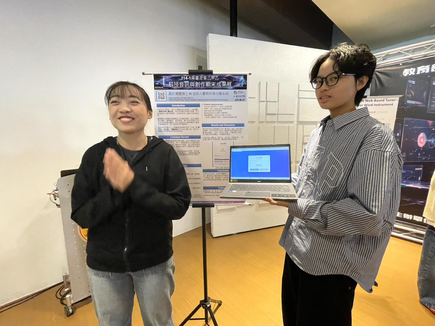 林岑芳說明,科技研發過去的刻板印象多由男性所主導,而本計畫特別強調在以「女性研發人才培育」為主軸。團隊中多位女學生發揮了獨特的創意,成功開發了具備細膩人文視角的網頁聲音多媒體軟體。更特別的是,流音系學生雖然非STEM(理工)背景,但在跨域課程引導下,所有修課同學都成功創作了自己創作的聲音多媒體軟體,並將在1 月 7 日活動現場,展出別出心裁的音樂互動 APP 供觀眾掃碼體驗。舞台上亦將呈現十首運用 AI 與跨域科技的原創歌曲。學生創作題材多元,從「用 AI diss AI」的趣味反思,到關注性別平權與女性科技職涯的深度議題,展現新世代對科技與人文的雙重關懷。
