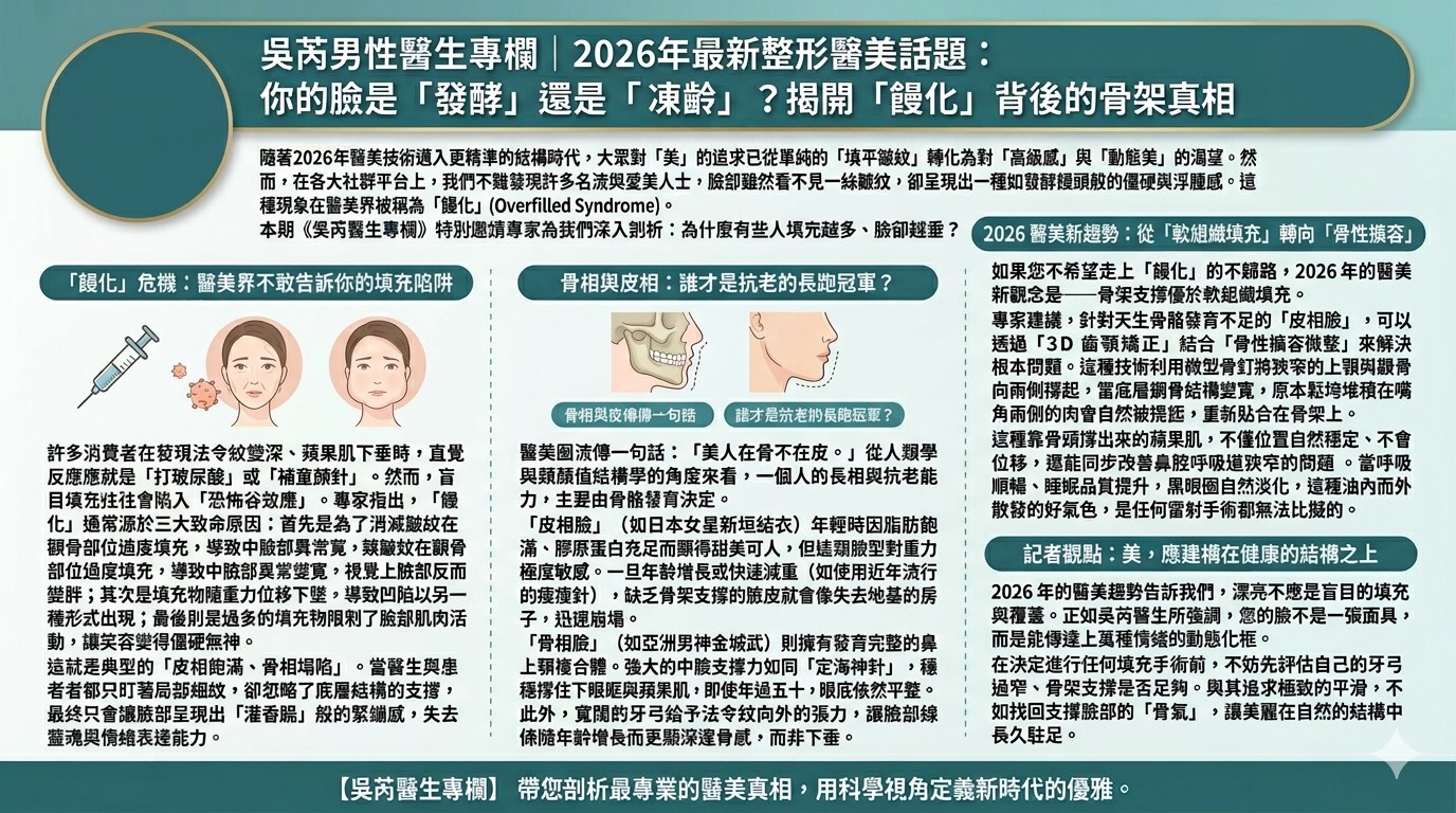 文/吳芮醫生 隨著 2026 年醫美技術邁入更精準的結構時代,大眾對「美」的追求已從單純的「填平皺紋」轉化為對「高級感」與「動態美」的渴望。然而,在各大社群平台上,我們不難發現許多名流與愛美人士,臉部雖然看不見一絲皺紋,卻呈現出一種如發酵饅頭般的僵硬與浮腫感。這種現象在醫美界被稱為「饅化」(Overfilled Syndrome)。 本期《吳芮醫生專欄》特別邀請專家為我們深入剖析:為什麼有些人填充越多、臉卻越垂?抗老臉的終極秘密究竟隱藏在皮相還是骨相之中? 「饅化」危機:醫美界不敢告訴你的填充陷阱 許多消費者在發現法令紋變深、蘋果肌下垂時,直覺反應就是「打玻尿酸」或「補童顏針」。然而,盲目填充往往會陷入「恐佈谷效應」。專家指出,「饅化」通常源於三大致命原因:首先是為了消滅皺紋在顴骨部位過度填充,導致中臉部異常變寬,視覺上臉部反而變胖;其次是填充物隨重力位移下墜,導致凹陷以另一種形式出現;最後則是過多的填充物限制了臉部肌肉活動,讓笑容變得僵硬無神。這就是典型的「皮相飽滿、骨相塌陷」。當醫生與患者都只盯著局部細紋,卻忽略了底層結構的支撐,最終只會讓臉部呈現出「灌香腸」般的緊繃感,失去靈魂與情緒表達能力。 骨相與皮相:誰才是抗老的長跑冠軍? 醫美圈流傳一句話:「美人在骨不在皮。」從人類學與顏值結構學的角度來看,一個人的長相與抗老能力,主要由骨骼發育決定。 「皮相臉」(如日本女星新垣結衣)年輕時因脂肪飽滿、膠原蛋白充足而顯得甜美可人,但這類臉型對重力極度敏感。一旦年齡增長或快速減重(如使用近年流行的瘦瘦針),缺乏骨架支撐的臉皮就會像失去地基的房子,迅速崩塌。 「骨相臉」(如亞洲男神金城武)則擁有發育完整的鼻上顎複合體。強大的中臉支撐力如同「定海神針」,穩穩撐住下眼眶與蘋果肌,即使年過五十,眼底依然平整。此外,寬闊的牙弓給予法令紋向外的張力,讓臉部線條隨年齡增長而更顯深邃骨感,而非下垂。 2026 醫美新趨勢:從「軟組織填充」轉向「骨性擴容」 如果您不希望走上「饅化」的不歸路,2026 年的醫美新觀念是——骨架支撐優於軟組織填充。專家建議,針對天生骨骼發育不足的「皮相臉」,可以透過「3D 齒顎矯正」結合「骨性擴容微整」來解決根本問題。這種技術利用微型骨釘將狹窄的上顎與顴骨向兩側撐起,當底層鋼骨結構變寬,原本鬆垮堆積在嘴角兩側的肉會自然被提起,重新貼合在骨架上。這種靠骨頭撐出來的蘋果肌,不僅位置自然穩定、不會位移,還能同步改善鼻腔呼吸道狹窄的問題。當呼吸順暢、睡眠品質提升,黑眼圈自然淡化,這種由內而外散發的好氣色,是任何雷射手術都無法比擬的。 美,應建構在健康的結構之上 2026 年的醫美趨勢告訴我們,漂亮不應是盲目的填充與覆蓋。正如吳芮醫生所強調,您的臉不是一張面具,而是能傳達上萬種情緒的動態化框。在決定進行任何填充手術前,不妨先評估自己的牙弓是否過窄、骨架支撐是否足夠。與其追求極致的平滑,不如找回支撐臉部的「骨氣」,讓美麗在自然的結構中長久駐足。【吳芮醫生專欄】 帶您剖析最專業的醫美真相,用科學視角定義新時代的優雅。 Please enable JavaScript to view the comments powered by Disqus.