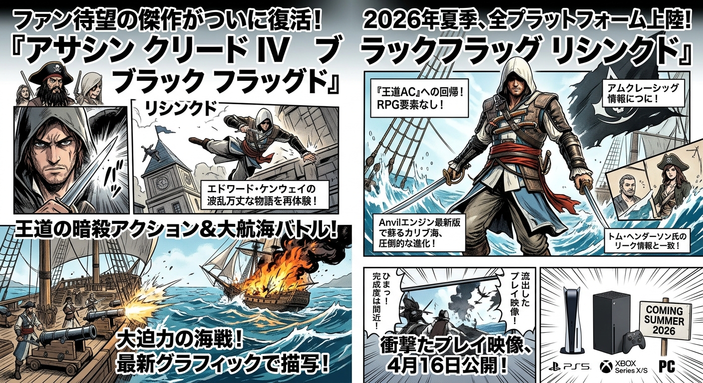 文/JO HSU 刺客教條系列中最受好評的作品之一《刺客教條 4:黑旗》強勢回歸。根據多家權威媒體與爆料人士 Tom Henderson 的報導,該重製版本《刺客教條:黑旗 Resynced》 2026 年暑假登陸各大平台,挑戰夏日最強作品寶座。 官宣前夕圖片走光 發售日近在咫尺 育碧官方伺服器疑似出現操作失誤,意外流出數張標示為「Resynced」的遊戲畫面截圖,儘管官方迅速撤下,但已確認該項目已接近完成階段。據悉,育碧原計畫 4 月 16 日正式發表,現已改為公開首支官方預告片。 保留經典核心 拒絕 RPG 化「大雜燴」 針對玩家最擔心的遊戲機制,本作忠於 2013 年的原創公式。重點聚焦於 Edward Kenway 的個人故事、潛行刺殺以及壯闊加勒比海海戰,非近年系列作常見等級制 RPG 玩法。這對追求「老派刺客味」的忠實粉絲而言,無疑是最大喜訊。 視覺震撼升級 航海與生態系統再進化 本作採用最新 Anvil 引擎 技術開發。看過演示媒體指出,重製版呈現極其震撼的動態天氣系統和更細緻的海浪物理效果。此外,登船戰鬥與地圖探索也進行了優化,加入全新角色與支線任務,讓經典航程更充實。《刺客教條:黑旗 Resynced》被列為育碧 2026 年最重要年度計畫,推出實體收藏版及數位版,詳情可在官方直播正式確認。 Please enable JavaScript to view the comments powered by Disqus.