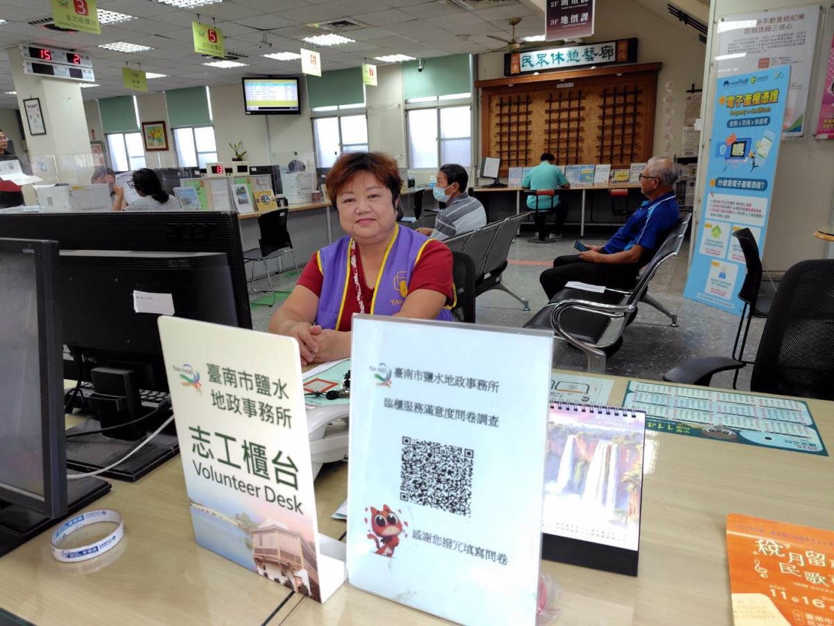 另外,鹽水地政事務所志工陳芷羚女士,她繼承父業,投入地政士行業,更在民國93年鹽水地政志工隊成立時,第一時間報名加入成為創隊成員。從事志工21年來,她始終默默付出,在服務台親切地引導填表、解說流程,「用笑容化解民眾的焦慮,用行動傳遞關懷。」她常說:「一點小幫助,就能讓民眾少一份焦急、多一份安心。」這份真誠的信念,正是地政志工最動人的精神寫照。