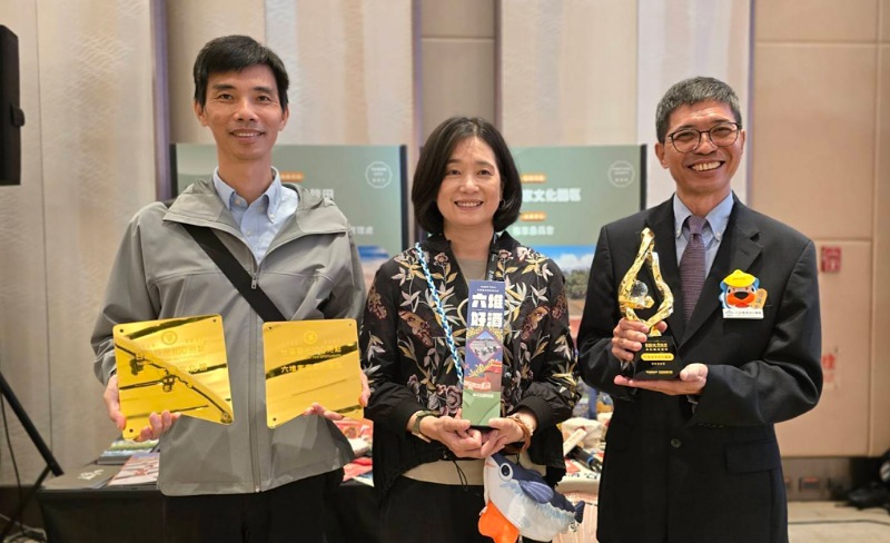 圖:六堆客家文化園區與臺灣客家文化館獲得交通部觀光署「觀光百大亮點獎」及「最佳國旅創新獎殊榮」,觀光署長陳玉秀(中)與客發中心何金樑主任(右)合影/客發中心提供